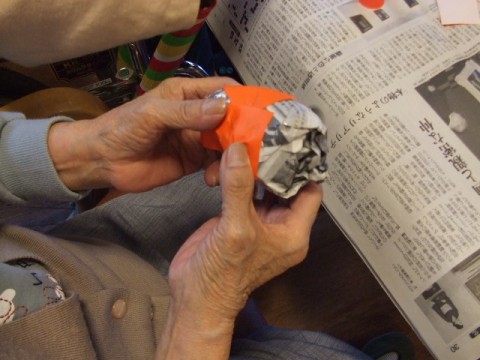 新聞紙を柿の形に丸めて、それに色紙を貼り付けて