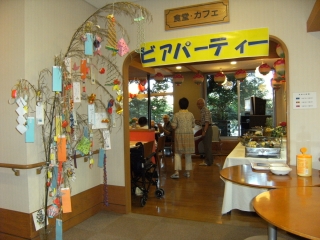会場(食堂)の入口には、七夕の笹を飾り、利用者様の願い事を